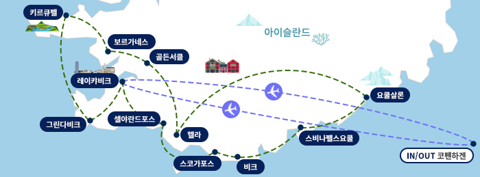 인천-기내(1)-코펜하겐(경유)-레이캬비크(1)-스나이펠스네스-키르큐펠-보르가네스(1)-골든서클-헬라(1)-셀랴란드포스-디르홀레이-비크-요쿨살롱-키르큐배야르클라우스투르(1)-스비나펠스요쿨-비크-스코가포스-케플라비크(1)-코펜하겐-기내(1)-인천